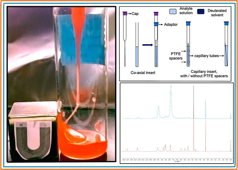 The present study focuses on the synthesis and characterization of lanthanide-containing paramagnetic ionic liquids (ILs), [CnC1Im]3[MCl3X3] (n = 4, 6, and 8; M = Gd, Dy, and Ho; X = Br and Cl), derived from 1-alkyl-3-methylimidazolium anions. These paramagnetic ILs exhibit low vapor pressure, high thermal stability, physiochemical stability, and tunability, along with significant magnetic susceptibility, making them of interest in advanced material applications that may take advantage of neat liquids with magnetic susceptibility. Structural and physical properties were determined using FTIR, 1H NMR, DSC, and TGA. The room temperature density and viscosity of the iron paramagnetic ILs were also reported. Accompanying this report of paramagnetic IL products, we reintroduce and highlight Evan’s NMR technique, an accessible magnetic susceptibility measurement technique that can utilize any available proton NMR to characterize the magnetic susceptibility of ILs. This work demonstrates the robustness of Evan’s technique by demonstrating the ability to account for the IL water content, a common issue for hygroscopic materials, during the measurement of magnetic susceptibility. A detailed comparison of the ILs is presented, with dysprosium- and holmium-containing paramagnetic ILs exhibiting the highest magnetic susceptibility reported for mononuclear ILs reported to date. These materials have been studied with an eye on applications for mass transfer, eventually seeking to optimize magnetic susceptibility and viscosity using magnetic field gradients to move paramagnetic ILs carrying solute or heat. The study of paramagnetic ILs is important not only for understanding the magnetic properties of these materials but also for potential applications in areas such as magnetic resonance imaging, biomedicine, environmental remediation, and mass transfer. These unique materials have the potential to bring about new advances and technologies in the fields of materials science and analytical chemistry.